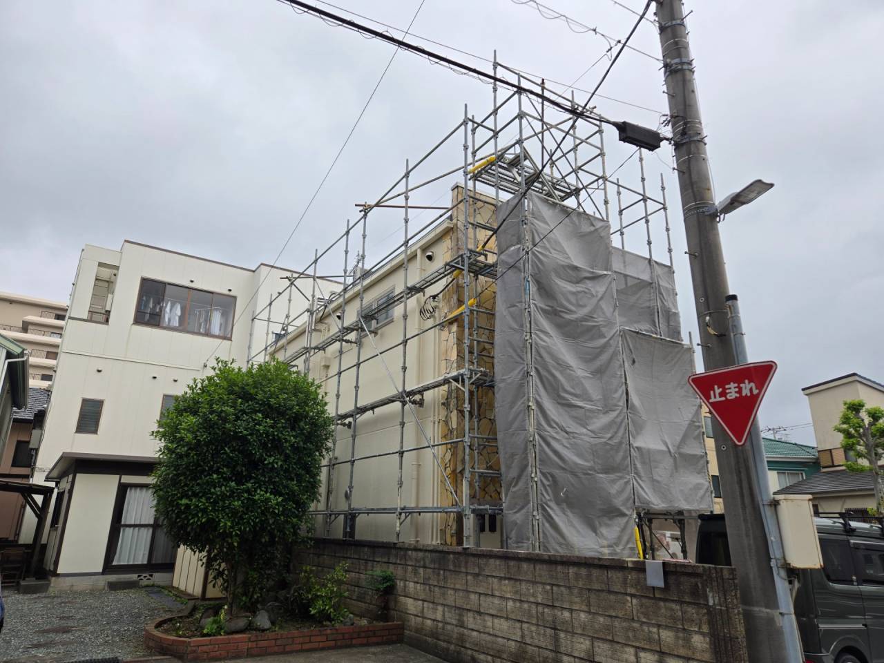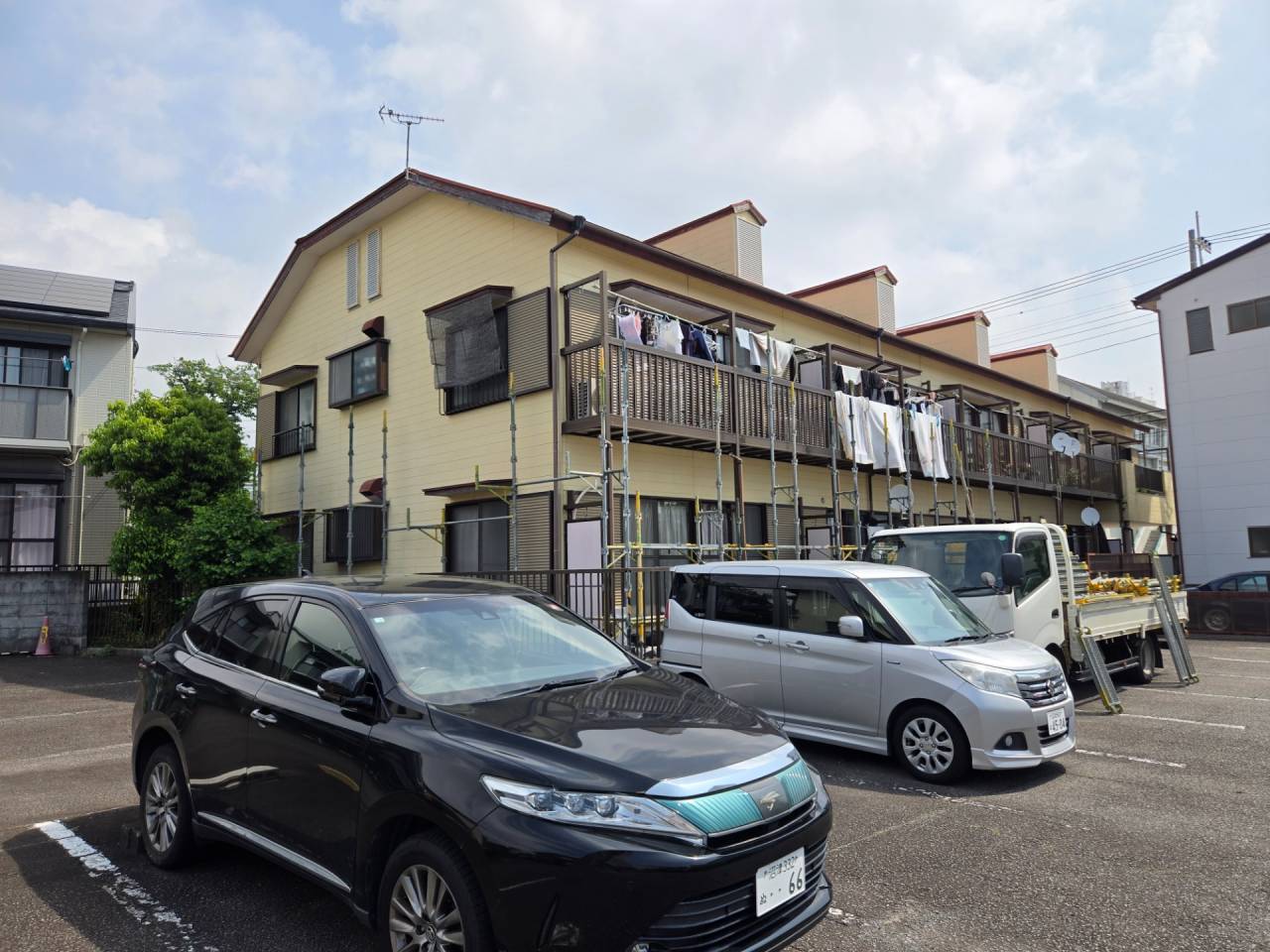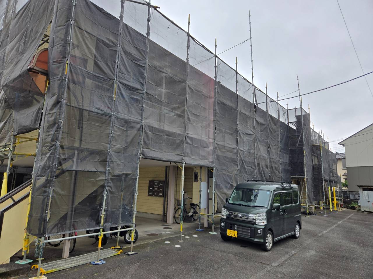 足場仮設 2025/05/21 お疲れ様です😆🎵🎵 アパートの足場仮設が昨日から始まりました。 23.24で高圧洗浄になりますね。 近くでやっていた現場は塗装完了ですね。あとは石調部分のシーリングして完了になりますね。 後少し頑張っていきましょう\(^_^)/ 静岡市清水区住宅、アパート塗装は榮信塗装にお任せください\(^_^)/ 施工日誌